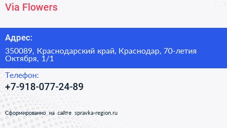 Via Flowers по адресу 350089, Краснодарский край, Краснодар, 70-летия Октября, 1/1 в дальнейшем Организация, размещена в следующих категориях: