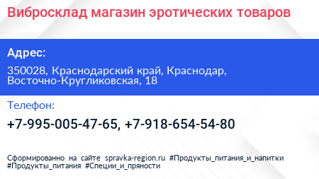 Вибросклад, магазин эротических товаров по адресу 350028, Краснодарский край, Краснодар, Восточно-Кругликовская, 18 в дальнейшем Организация, размещена в следующих категориях: