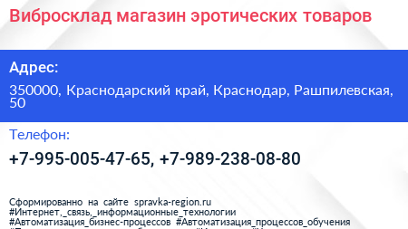Вибросклад, магазин эротических товаров по адресу 350000, Краснодарский край, Краснодар, Рашпилевская, 50 в дальнейшем Организация, размещена в следующих категориях: