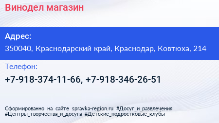 Винодел, магазин по адресу 350040, Краснодарский край, Краснодар, Ковтюха, 214 в дальнейшем Организация, размещена в следующих категориях: