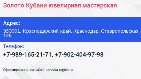 Золото Кубани, ювелирная мастерская по адресу 350001, Краснодарский край, Краснодар, Ставропольская, 128 в дальнейшем Организация, размещена в следующих категориях: