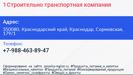 1 Строительно-транспортная компания по адресу 350080, Краснодарский край, Краснодар, Сормовская, 179/1 в дальнейшем Организация, размещена в следующих категориях: