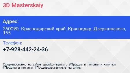 3D-Masterskaiy по адресу 350090, Краснодарский край, Краснодар, Дзержинского, 155 в дальнейшем Организация, размещена в следующих категориях: