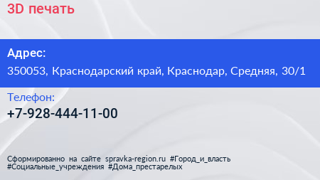 3D-печать по адресу 350053, Краснодарский край, Краснодар, Средняя, 30/1 в дальнейшем Организация, размещена в следующих категориях: