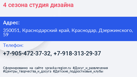 4 сезона, студия дизайна по адресу 350051, Краснодарский край, Краснодар, Дзержинского, 59 в дальнейшем Организация, размещена в следующих категориях: