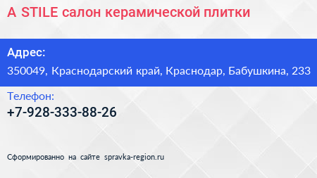 A-STILE, салон керамической плитки по адресу 350049, Краснодарский край, Краснодар, Бабушкина, 233 в дальнейшем Организация, размещена в следующих категориях: