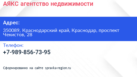 АЯКС, агентство недвижимости по адресу 350089, Краснодарский край, Краснодар, проспект Чекистов, 28 в дальнейшем Организация, размещена в следующих категориях: