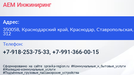 АЕМ-Инжиниринг по адресу 350058, Краснодарский край, Краснодар, Ставропольская, 312 в дальнейшем Организация, размещена в следующих категориях: