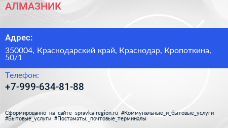 АЛМАЗНИК по адресу 350004, Краснодарский край, Краснодар, Кропоткина, 50/1 в дальнейшем Организация, размещена в следующих категориях: