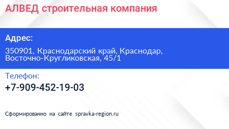 АЛВЕД, строительная компания по адресу 350901, Краснодарский край, Краснодар, Восточно-Кругликовская, 45/1 в дальнейшем Организация, размещена в следующих категориях: