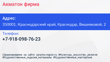 Для связи с организацией воспользуйтесь номером телефона: +7-918-098-76-23. Ежедневно с 09:00 до 18:00. по предварительной записи: сб-вс, вы можете обратиться в эту организацию.