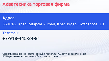 Акватехника, торговая фирма по адресу 350016, Краснодарский край, Краснодар, Котлярова, 13 в дальнейшем Организация, размещена в следующих категориях: