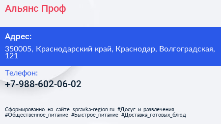 Альянс Проф по адресу 350005, Краснодарский край, Краснодар, Волгоградская, 121 в дальнейшем Организация, размещена в следующих категориях: