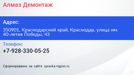 Алмаз Демонтаж по адресу 350901, Краснодарский край, Краснодар, улица им. 40-летия Победы, 43 в дальнейшем Организация, размещена в следующих категориях: