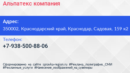 Альпатекс, компания по адресу 350002, Краснодарский край, Краснодар, Садовая, 159 к2 в дальнейшем Организация, размещена в следующих категориях: