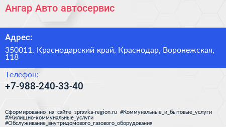 Ангар Авто, автосервис по адресу 350011, Краснодарский край, Краснодар, Воронежская, 118 в дальнейшем Организация, размещена в следующих категориях: