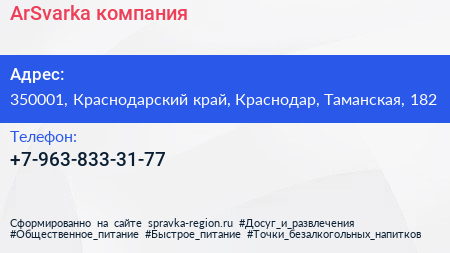 ArSvarka, компания по адресу 350001, Краснодарский край, Краснодар, Таманская, 182 в дальнейшем Организация, размещена в следующих категориях:
