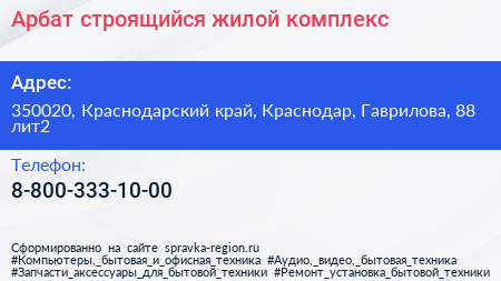 Арбат, строящийся жилой комплекс по адресу 350020, Краснодарский край, Краснодар, Гаврилова, 88 лит2 в дальнейшем Организация, размещена в следующих категориях: