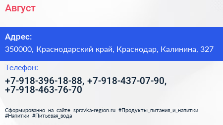 Август по адресу 350000, Краснодарский край, Краснодар, Калинина, 327 в дальнейшем Организация, размещена в следующих категориях: