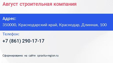 Август, строительная компания по адресу 350000, Краснодарский край, Краснодар, Длинная, 100 в дальнейшем Организация, размещена в следующих категориях: