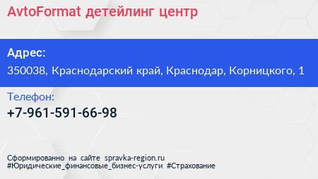 AvtoFormat, детейлинг-центр по адресу 350038, Краснодарский край, Краснодар, Корницкого, 1 в дальнейшем Организация, размещена в следующих категориях: