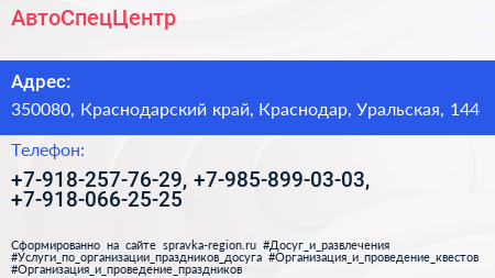 АвтоСпецЦентр по адресу 350080, Краснодарский край, Краснодар, Уральская, 144 в дальнейшем Организация, размещена в следующих категориях: