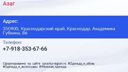 Азаг по адресу 350900, Краснодарский край, Краснодар, Академика Губкина, 86 в дальнейшем Организация, размещена в следующих категориях: