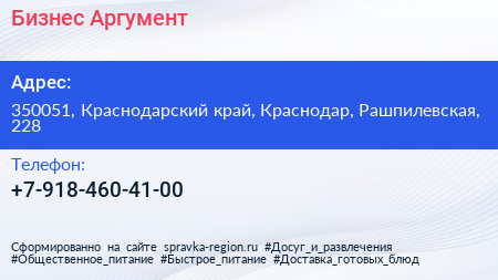 Бизнес-Аргумент по адресу 350051, Краснодарский край, Краснодар, Рашпилевская, 228 в дальнейшем Организация, размещена в следующих категориях: