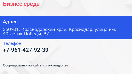 Бизнес среда по адресу 350901, Краснодарский край, Краснодар, улица им. 40-летия Победы, 97 в дальнейшем Организация, размещена в следующих категориях: