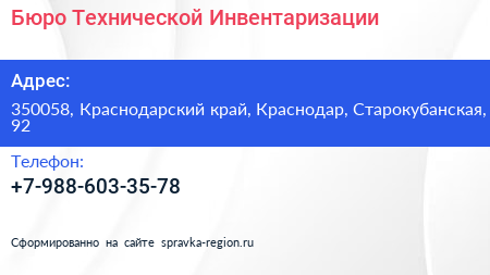 Бюро Технической Инвентаризации по адресу 350058, Краснодарский край, Краснодар, Старокубанская, 92 в дальнейшем Организация, размещена в следующих категориях: