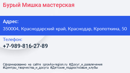 Бурый Мишка, мастерская по адресу 350004, Краснодарский край, Краснодар, Кропоткина, 50 в дальнейшем Организация, размещена в следующих категориях: