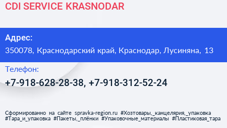 CDI SERVICE KRASNODAR по адресу 350078, Краснодарский край, Краснодар, Лусиняна, 13 в дальнейшем Организация, размещена в следующих категориях: