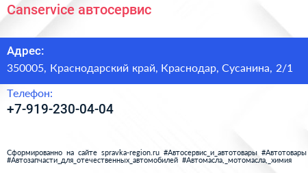 Canservice, автосервис по адресу 350005, Краснодарский край, Краснодар, Сусанина, 2/1 в дальнейшем Организация, размещена в следующих категориях: