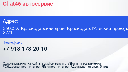 Chat46, автосервис по адресу 350039, Краснодарский край, Краснодар, Майский проезд, 22/1 в дальнейшем Организация, размещена в следующих категориях: