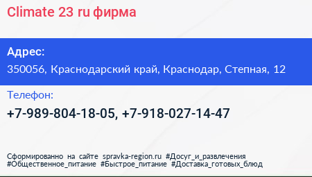 Climate-23.ru, фирма по адресу 350056, Краснодарский край, Краснодар, Степная, 12 в дальнейшем Организация, размещена в следующих категориях: