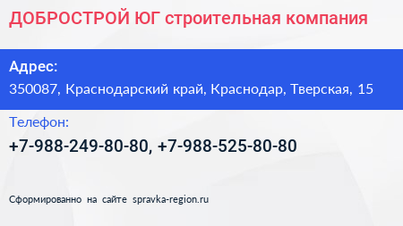 ДОБРОСТРОЙ-ЮГ, строительная компания по адресу 350087, Краснодарский край, Краснодар, Тверская, 15 в дальнейшем Организация, размещена в следующих категориях: