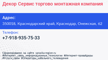 Декор Сервис, торгово-монтажная компания по адресу 350018, Краснодарский край, Краснодар, Онежская, 62 в дальнейшем Организация, размещена в следующих категориях: