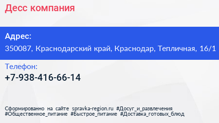 Десс, компания по адресу 350087, Краснодарский край, Краснодар, Тепличная, 16/1 в дальнейшем Организация, размещена в следующих категориях: