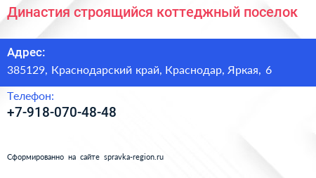 Династия, строящийся коттеджный поселок по адресу 385129, Краснодарский край, Краснодар, Яркая, 6 в дальнейшем Организация, размещена в следующих категориях: