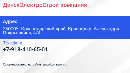 ДинскЭлектроСтрой, компания по адресу 350005, Краснодарский край, Краснодар, Александра Покрышкина, 4/4 в дальнейшем Организация, размещена в следующих категориях: