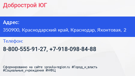 Добрострой-ЮГ по адресу 350900, Краснодарский край, Краснодар, Яхонтовая, 2 в дальнейшем Организация, размещена в следующих категориях:
