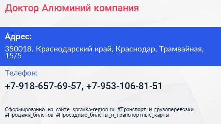 Доктор Алюминий, компания по адресу 350018, Краснодарский край, Краснодар, Трамвайная, 15/5 в дальнейшем Организация, размещена в следующих категориях: