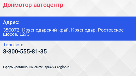 Донмотор, автоцентр по адресу 350072, Краснодарский край, Краснодар, Ростовское шоссе, 12/3 в дальнейшем Организация, размещена в следующих категориях: