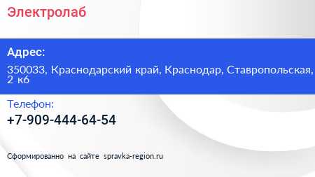Электролаб по адресу 350033, Краснодарский край, Краснодар, Ставропольская, 2 к6 в дальнейшем Организация, размещена в следующих категориях: