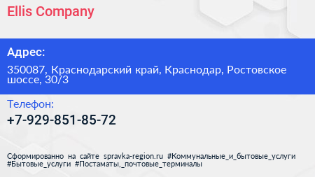 Ellis Company по адресу 350087, Краснодарский край, Краснодар, Ростовское шоссе, 30/3 в дальнейшем Организация, размещена в следующих категориях: