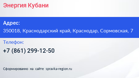 Энергия Кубани по адресу 350018, Краснодарский край, Краснодар, Сормовская, 7 в дальнейшем Организация, размещена в следующих категориях: