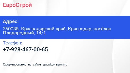 ЕвроСтрой по адресу 350038, Краснодарский край, Краснодар, посёлок Плодородный, 14/1 в дальнейшем Организация, размещена в следующих категориях:
