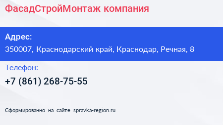 ФасадСтройМонтаж, компания по адресу 350007, Краснодарский край, Краснодар, Речная, 8 в дальнейшем Организация, размещена в следующих категориях:
