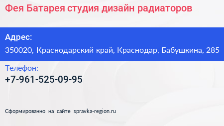 Фея Батарея, студия дизайн-радиаторов по адресу 350020, Краснодарский край, Краснодар, Бабушкина, 285 в дальнейшем Организация, размещена в следующих категориях: