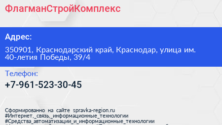 ФлагманСтройКомплекс по адресу 350901, Краснодарский край, Краснодар, улица им. 40-летия Победы, 39/4 в дальнейшем Организация, размещена в следующих категориях: